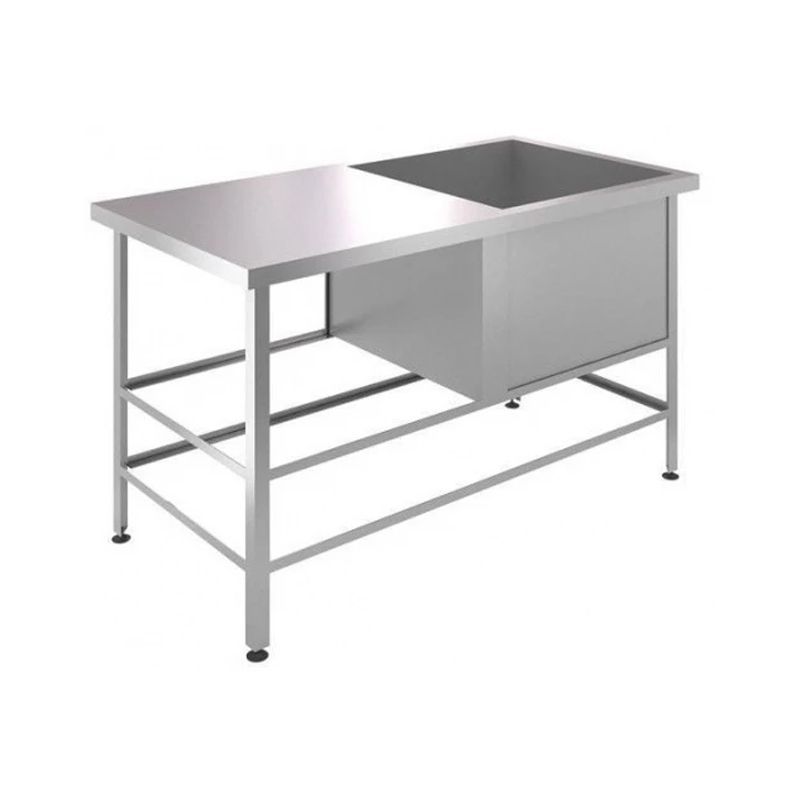 Изделие выполнено из оцинкованной стали, сварной каркас – из углового профиля, нижняя обвязка с 4 сторон – из профиля из оцинкованной стали, сварная раковина – из нержавеющей стали AISI 430, столешница – из нержавеющей стали AISI 430, подпятники опор – из прочного пластика. Модель оснащена 1 раковиной справа и рабочей поверхностью слева.
