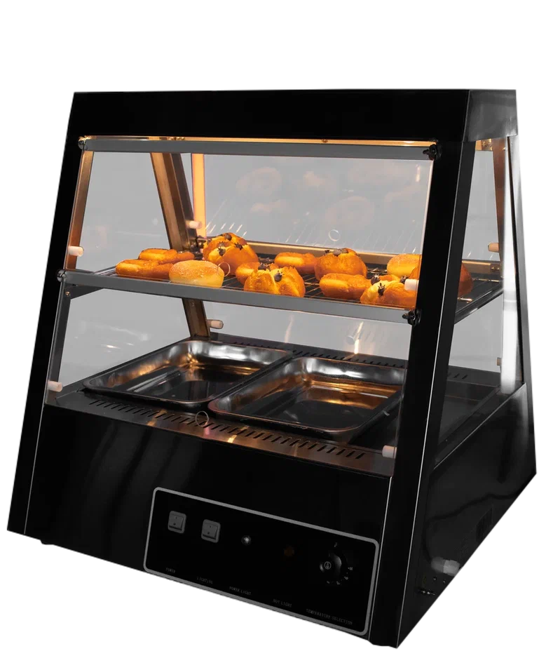 Витрина тепловая HW-2x3 производства Rosso (Китай) - профессиональное оборудование для демонстрации и поддержания блюд в горячем состоянии на предприятиях общественного питания и торговли. Напольная модель оснащена термостатом, декоративной лампой освещения и поворотным переключателем для выбора температуры. Две полки из нержавеющей стали обеспечивают удобную выкладку ассортимента.