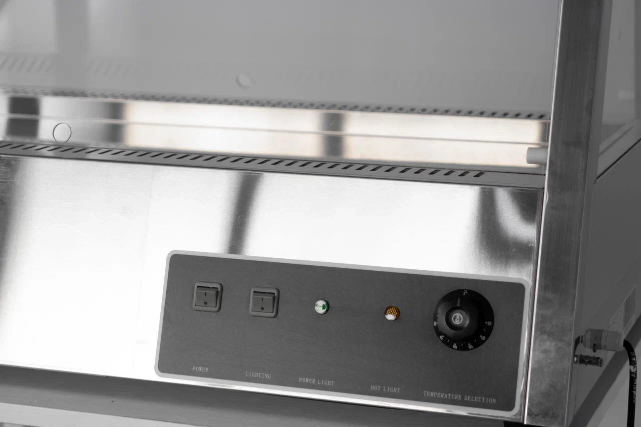 Витрина тепловая HW-2x4 производства Rosso (Китай) - профессиональное оборудование для демонстрации и поддержания блюд в горячем состоянии на предприятиях общественного питания и торговли. Настольная модель оснащена термостатом, декоративной лампой освещения и поворотным переключателем для выбора температуры. Две полки из нержавеющей стали обеспечивают удобную выкладку ассортимента.