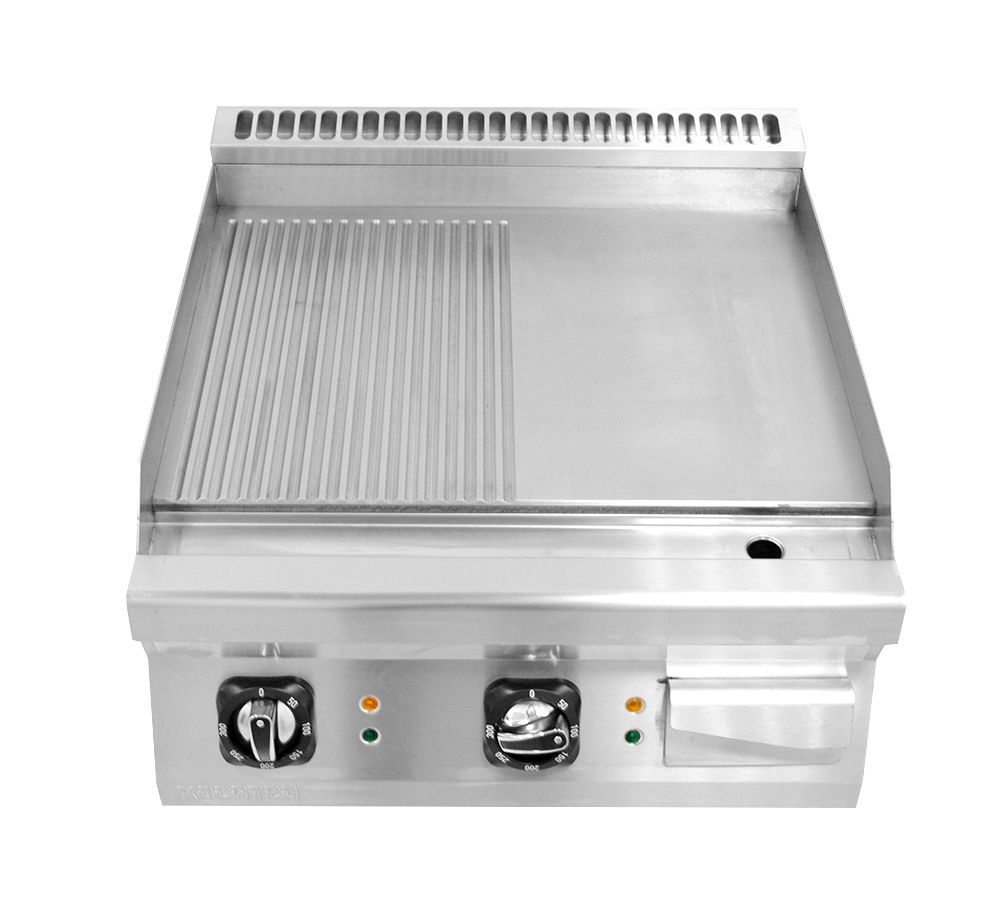 Поверхность оснащена комбинированной рабочей поверхностью и электромеханической панелью управления. Корпус выполнен из нержавеющей стали, рабочая поверхность – из хромированной высокоуглеродистой стали.